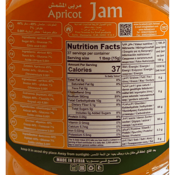 Ingredienser: Aprikoser, socker, vatten, geleringsmedel (pektin), citronsyra, konserveringsmedel.