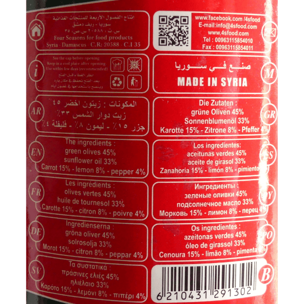 En färgstark blandning av skivade gröna oliver, paprika och grönsaker från Four Seasons – redo att serveras som ett smakrikt tillbehör till smörgåsar, grillat, sallader eller meze. Den oljebaserade lagen bevarar smaken och ger en lätt sälta med fyllig textur.