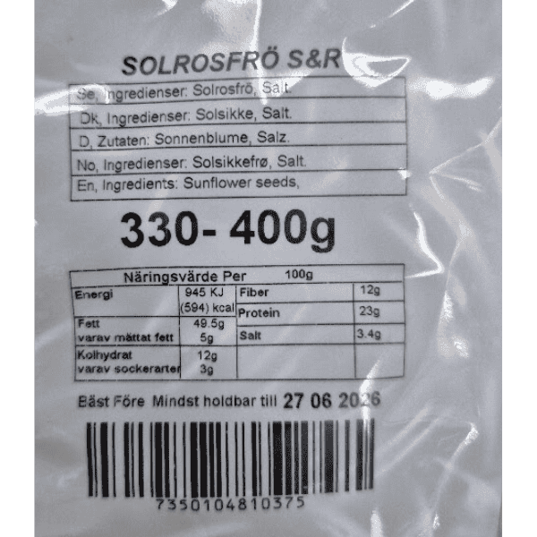 Produkten innehåller inga kända allergener. (Solrosfrön är inte en av de 14 vanligaste allergenerna som måste deklareras enligt EU-lagstiftning, men personer med specifika fröallergier bör vara försiktiga.)